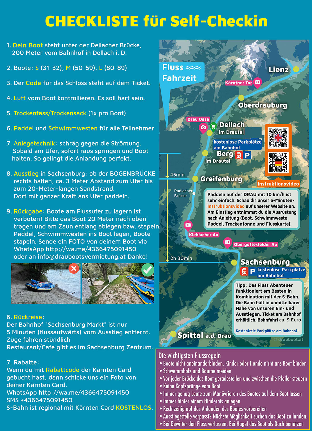 Boote können von 10:00 - 15:00 Uhr starten, die Rückgabe erfolgt bis 19 Uhr. Das Boot bitte zum angezeigten Ort am Ausstieg tragen. Eigenen Müll bitte selbst entsorgen.